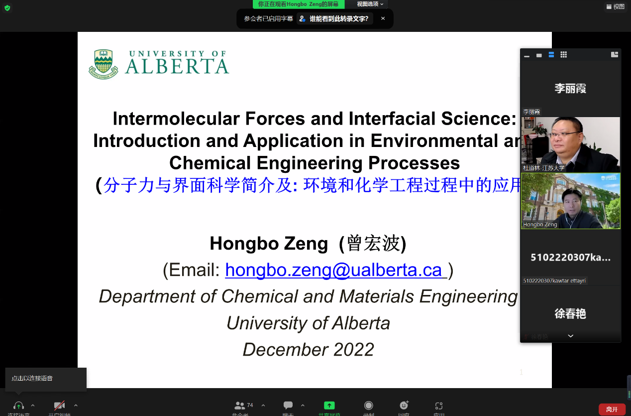师生与阿尔伯塔大学积极进行学术交流与合作。曾院士讲座受到与会师生的强烈好评,会后曾院士详细回答了师生提出的科研问题,交流意犹未尽。杜院长最后代表两院师生对曾宏波院士表示真诚的感谢,并表示以后一定会加强与曾教授团队的交流合作。