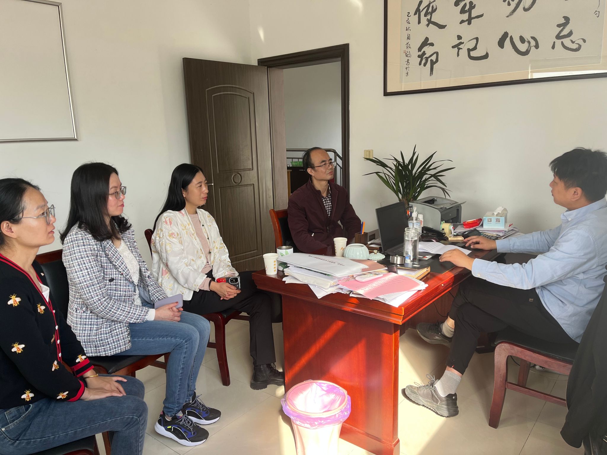 党委书记黄勇强,副书记、副院长杨博,党务办副主任曹霞,环境工程系教工党支部副书记贾慧,来到丹阳市司徒镇杏虎村,和杏虎村党支部书记黄兢商谈建立党建共建基地事宜。